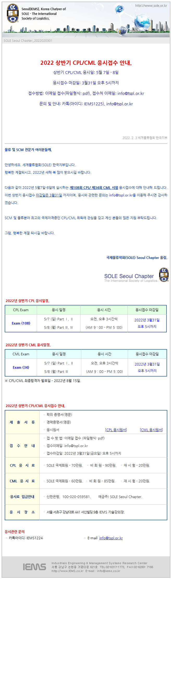 [SOLE] 2022³â »ó¹Ý±â CPL ÀÀ½ÃÁ¢¼ö ¾È³». (Á¢¼ö¸¶°¨ÀÏ: 3¿ù31ÀÏ)